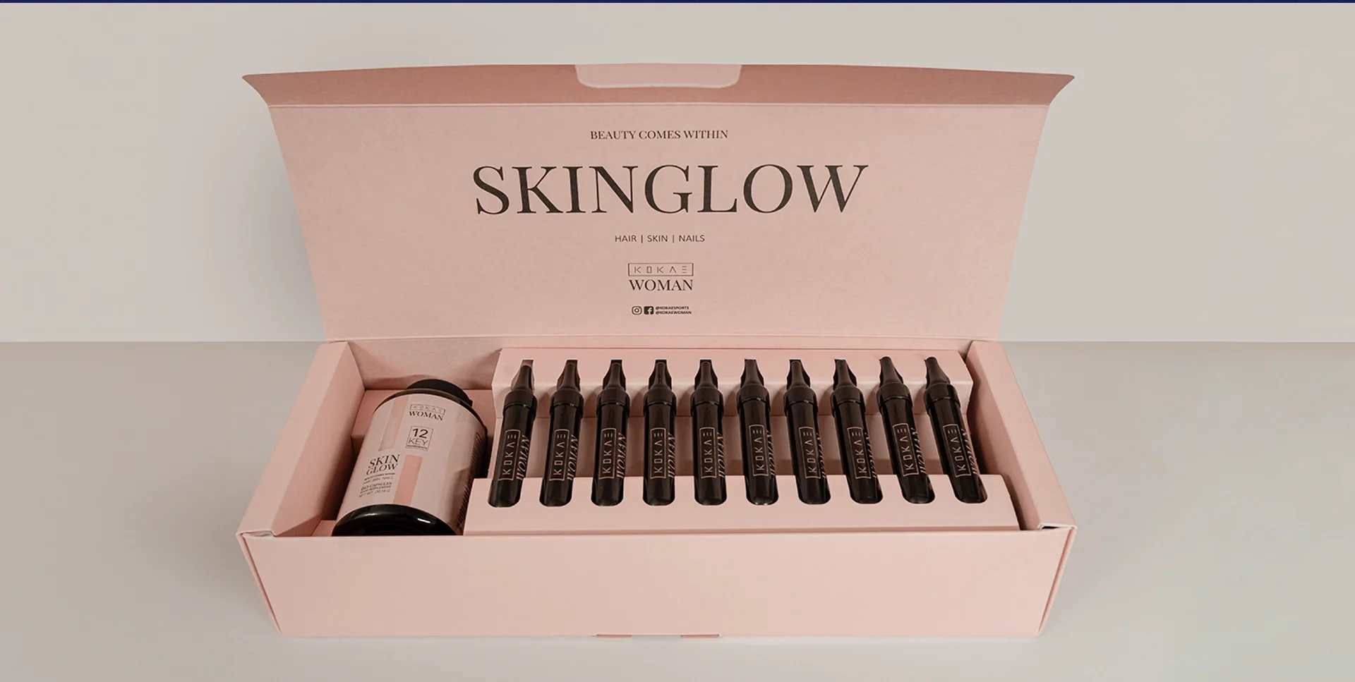 KOKAE® Woman is a Swiss wellness and beauty suplements brand that promotes beauty from within, combining science, effectiveness, and style for the modern woman. Its formulas enhance skin, hair, and nails through practical and elegant capsules and shots. The brand stands out for its exclusively female focus, sophisticated design, and commitment to visible results. Its identity blends The Caregiver and The Creator, conveying protection, wellness, and transformation. More than just a supplement, KOKAE represents a philosophy of conscious beauty, empowering women to feel radiant and confident from the inside out.